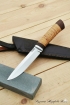 Рукоять выполнена из натуральной бересты — материала, который славится легкостью, приятной тактильностью и отличной цепкостью даже во влажных условиях или руках в перчатках. Береста не выскальзывает, придаёт ножу теплое, «живое» ощущение, снижает утомляемость руки при длительной работе. Натуральная структура бересты уникальна: каждый нож индивидуален по виду. Этот материал хорошо амортизирует вибрации, но требует периодической обработки воском или маслом для сохранения эстетики и долговечности.